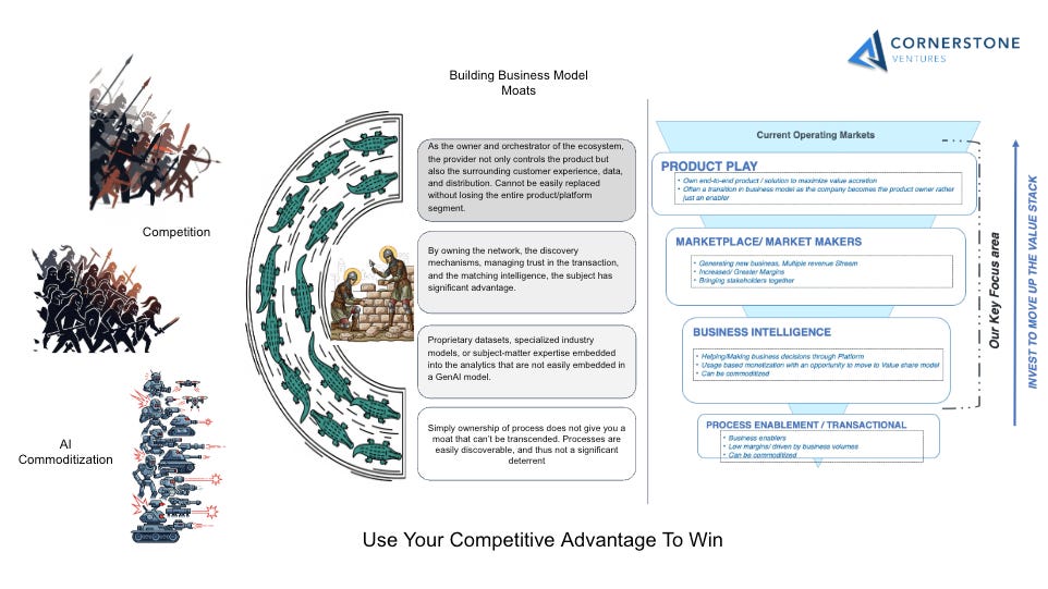 Diving a little deeper into the defensive moats available at each layer of the Value Proposition Stack to protect against Competition and AI commoditization: